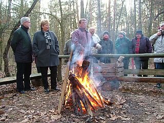 Am Kaiserstein, ein Gedenkstein für die Kaiserjagden in der Letzlinger Heide, erwartete die Wanderer eine angenehme Überraschung, Herr Doktor Kleemann aus Letzlingen hatte für die Teilnehmer des Friedensweges ein wärmendes Feuer entzündet. Beim Anblick der leuchtenden Flamen und dem Prasseln des brennenden Holzes wurde Allen warm. Entlang der GÜZ-Absperrung führte der Weg vorbei an Wasch- und Werkstattanlagen, Fahrzeugen, Sturmbahn und Kasernen zurück zum Ausgangspunkt der Wanderung.