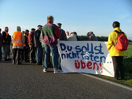 Treffpunkt des Friedensweges war die Einmündung der Verbindungsstraße (Heidestraße) zwischen der B 71 und B 189. Diese Straße führt direkt durch ein Trinkwasserschutzgebiet zu den Feldlagern der übenden Truppen in der Heide. Am Straßenrand standen Aufsteller und Transparente, um den vorbeifahrenden Sonntagsausflügern das Anliegen des Protestes näher zu bringen. Etwa 60 friedliebende Menschen haben sich an diesem Sonntag zur Kundgebung versammelt. Als besonderer Gast war der Nikolaus mit einem Sack voller friedlicher Gaben anwesend. Verteilte Äpfel, Nüsse und Friedenstaler an die Teilnehmer. Ein Anstecker an der Jacke mit der Aufschrift "Kein Krieg" zeigt deutlich die Gedanken des Nikolaus.