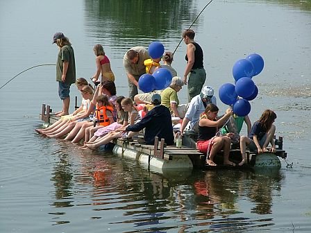 bunten Luftballons, nimmt es seine Fahrt ins Unbekannte auf. Das Wasser lädt zum Baden ein. Alle können diese Abkühlung an diesem heißen Tag vertragen. Nach gut zwei Stunden erscheint das Floß wieder am Ausgangspunkt mit glücklichen Kinderaugen. Ein schöner Tag in Frieden und für den Frieden geht zu Ende.