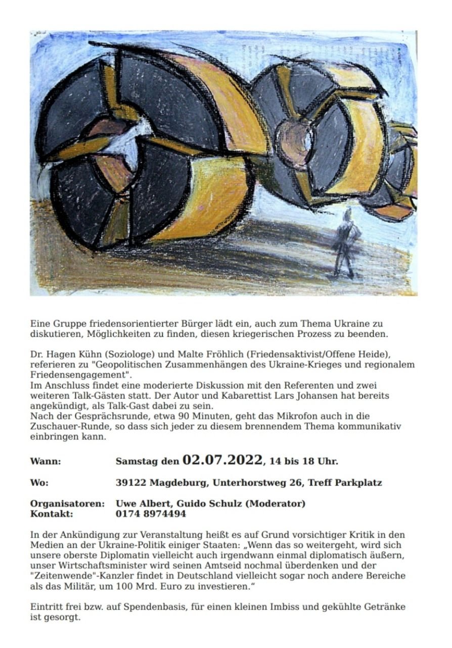 Am 26. 8. sollte es ein Gespräch mit Herrn Steinmeier in Stendal geben, zu dem Malte Fröhlich als ein Vertreter der BI OFFENEn HEIDe und des Stendaler Friedenskreises eingeladen wurde. Seine Absage in Form eines offenen Briefes befindet sich hier